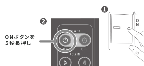 ②主電源(壁スイッチ)をONにしてから2秒~5秒以内にリモコンの左上にある「ON」ボタンを5秒間長押しする。